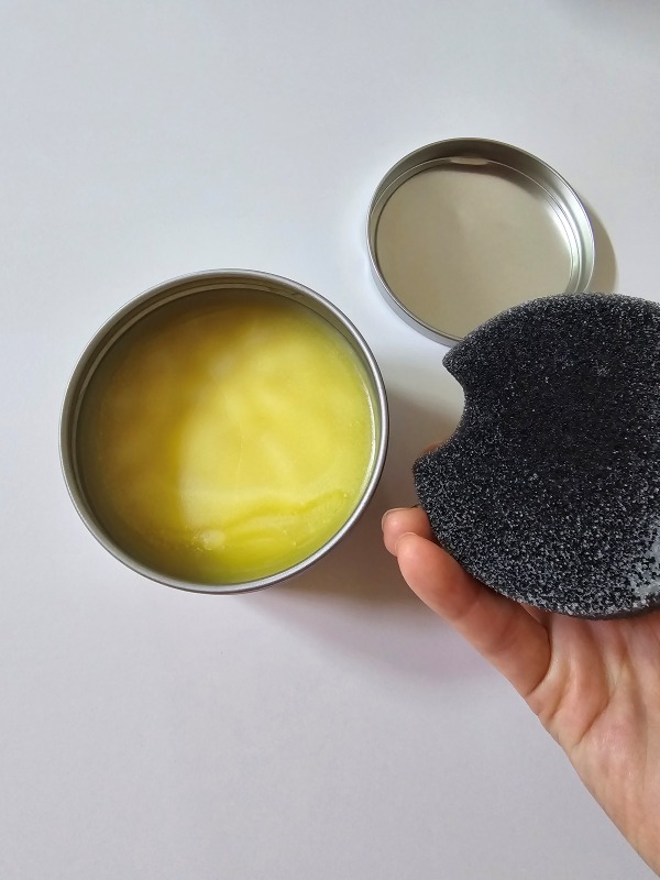 동그란 틴케이스 안에 스펀지와 함께 내용물이 들어있는데, 비즈왁스와 미네랄 오일로 이루어져 있어 인체에 무해하다고 해요. 스펀지에 내용물을 발라 도마에 코팅하듯이 발라주면 돼요.