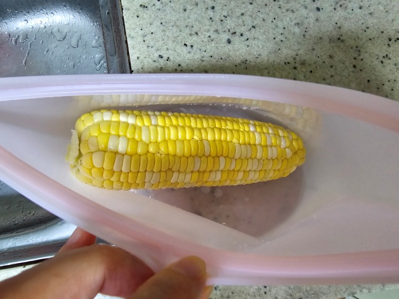 껍질을 벗긴 옥수수는 키친타올로 감싸 지퍼백에 넣어주세요.