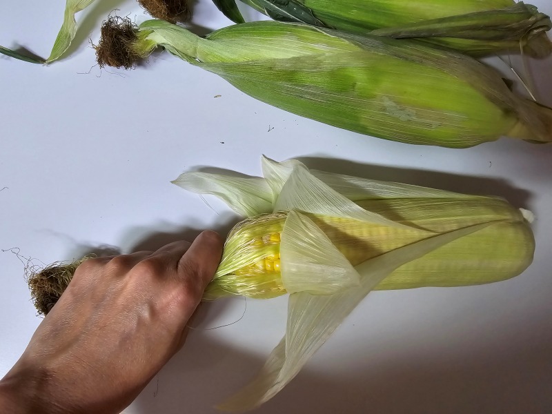 초당옥수수를 구입하면 겹겹이 껍질에 쌓여있습니다. 먼저 겉껍질을 벗겨주고, 옥수수 수염은 당겨서 제거해줍니다. 옥수수 알이 밖으로 나오면 수분이 마를 수 있어, 옥수수를 덮을 수 있을 만큼 3~4겹 정도는 남기고 껍질을 벗겨주세요.